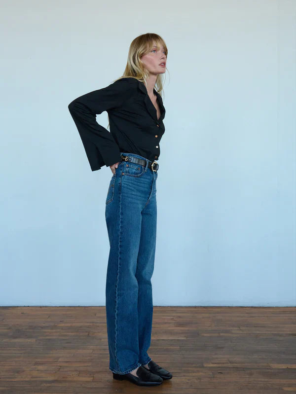 The Nation LTD. Cassidy Button Up Top in Black reinvents the classic button-up with playful vintage-inspired bell sleeves and a relaxed fit that feels effortlessly cool. Perfect for turning heads and collecting compliments wherever you go.