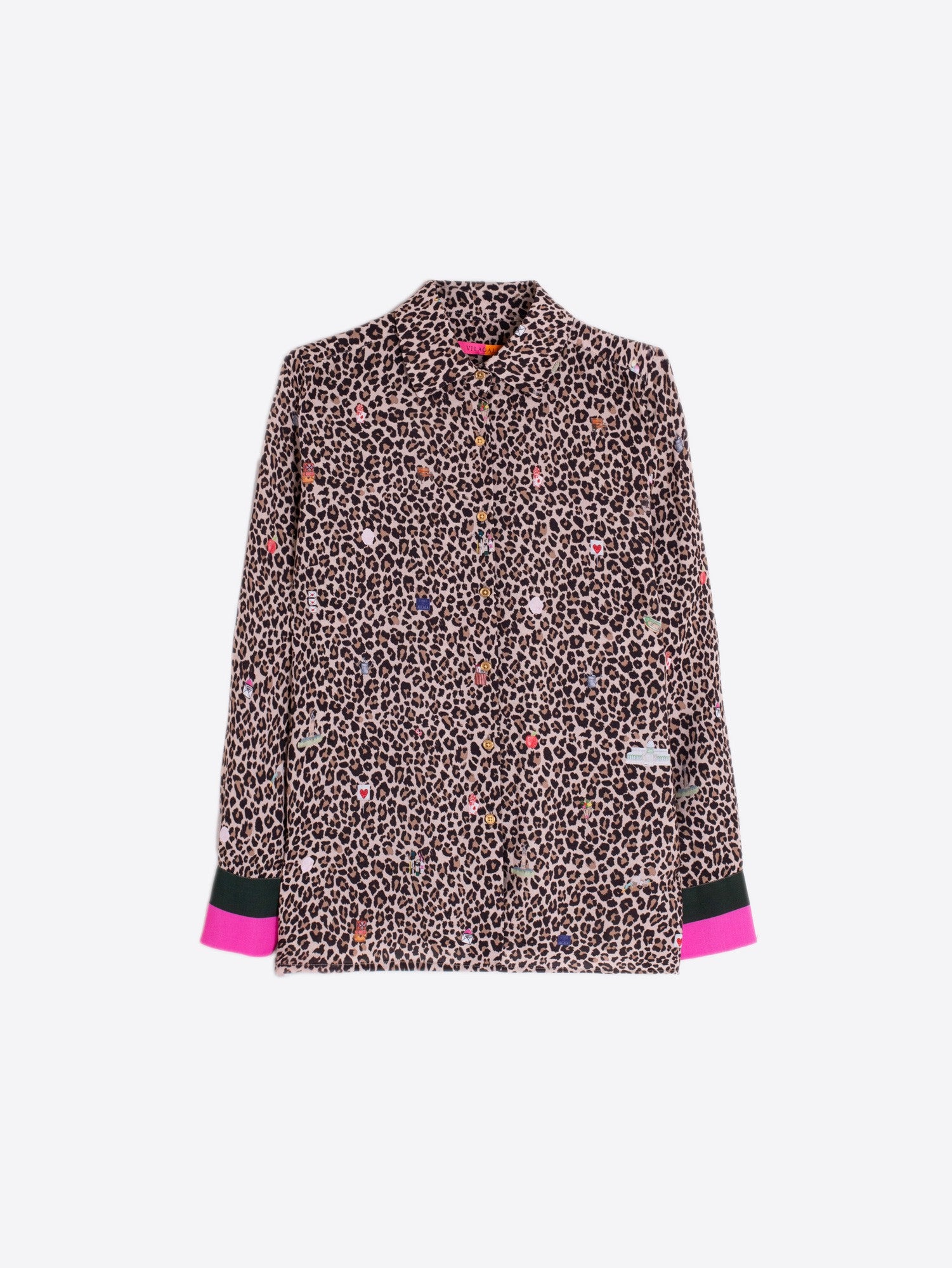Add a splash of wild charm to your wardrobe with the Vilagallo Mariela Leopard Print Shirt. Featuring a multicolour leopard pattern mixed with lively Retiro Park-inspired motifs, this straight-cut shirt brightens any outfit. The gold-button front and striking green and fuchsia bicolour cuffs add playful pops of color, while the classic collar keeps it chic. Crafted from a soft, flowing viscose-cotton blend, it feels as good as it looks—perfect for making a stylish statement with a fun twist.