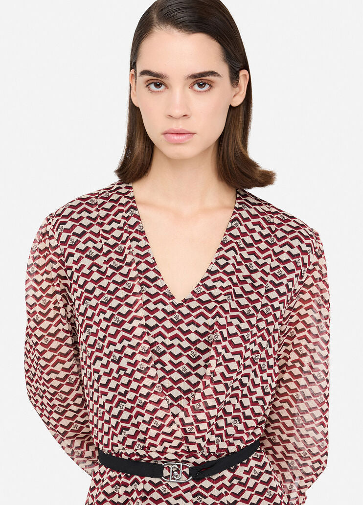 This playful short crepon dress features a vibrant all-over print enhanced with sparkling Lurex® inserts. Its flattering V-neck and long, sheer sleeves add a touch of elegance, while contrast cuffs bring a fun, unexpected twist. Perfect for turning heads with effortless style!