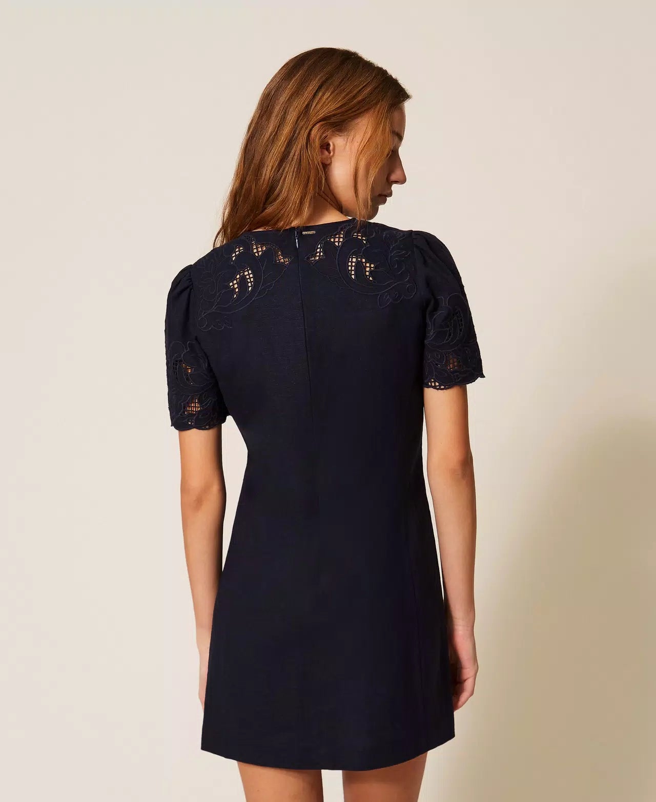 Effortlessly chic and undeniably charming, this short linen and viscose blend dress brings timeless elegance with a modern twist. The delicate floral openwork embroidery adorning the yoke and sleeves adds a playful touch of sophistication, while the round neckline and short sleeves keep things breezy and comfortable.