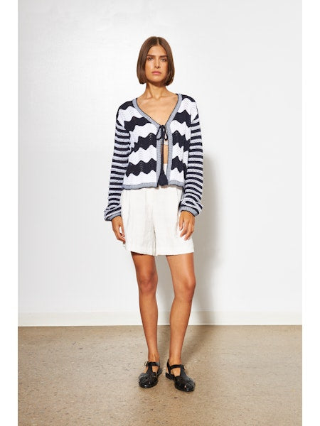 The Line The Label Willa Cardigan in Tidal Wave is a timeless layering piece crafted from soft cotton. This beautiful cardigan features a classic navy and white colorway with a charming front tie closure that adds effortless elegance to any outfit. Perfect for transitional seasons, it pairs seamlessly with dresses, tees, or worn open as a light layer.