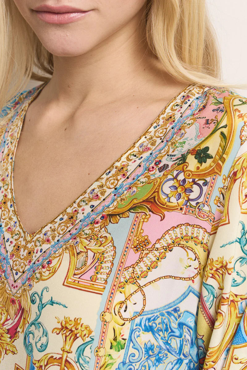 Embrace la dolce vita in this enchanting silk dress by Princess Goes Hollywood. Crafted from luxurious 100% silk, this airy silhouette features a flattering V-neck adorned with sparkling rhinestone details and dramatic wide sleeves that flow with effortless elegance. The slightly sheer fabric drapes beautifully, while the all-over Dolce Vita print adds a whimsical, artistic flair.