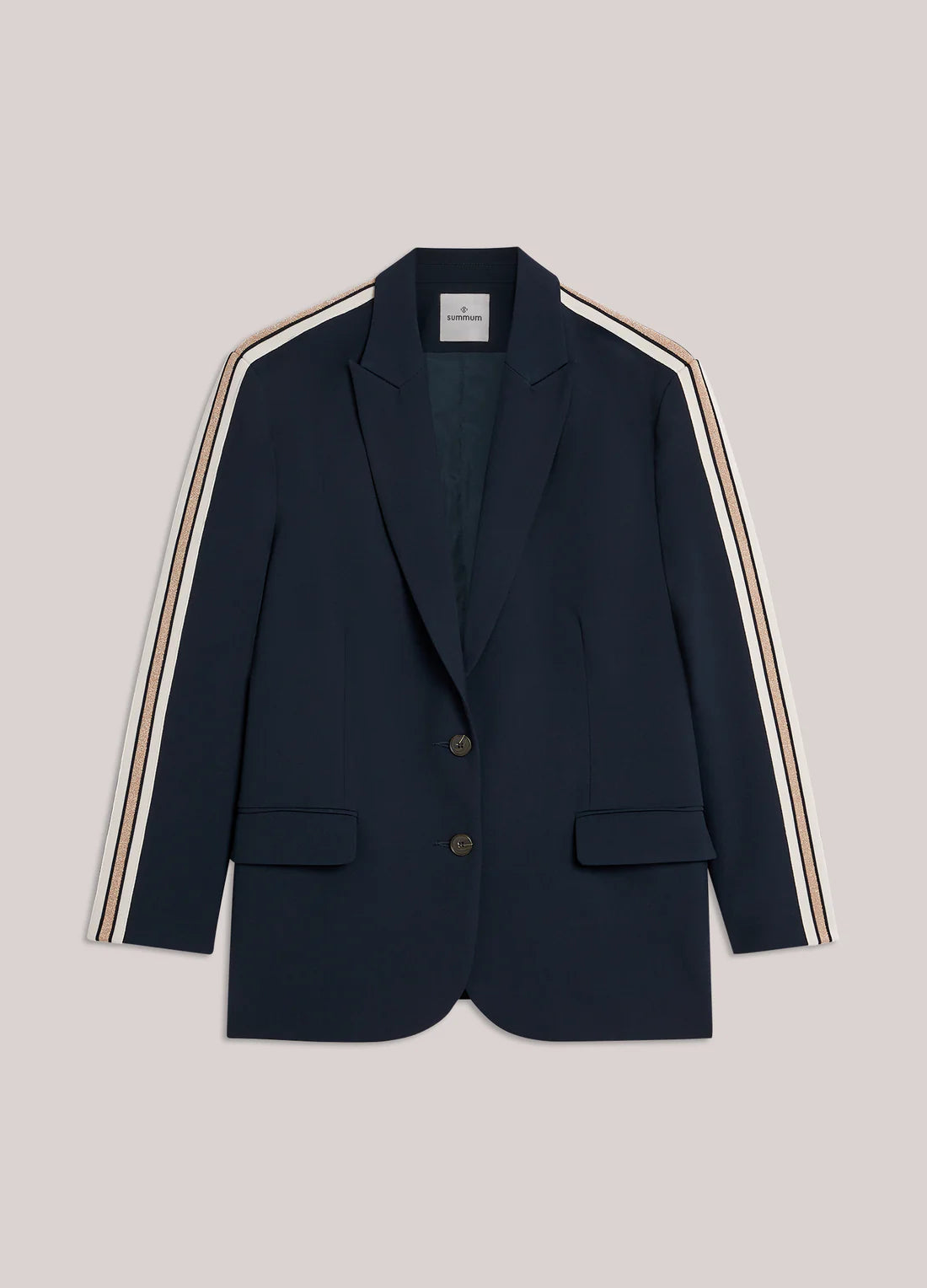 Effortlessly polished, this navy boyfriend blazer delivers relaxed sophistication with intentional style details. The loose-fitting silhouette drapes beautifully, while a distinctive striped band traces the shoulder and down the sleeve for visual interest. Classic lapel collar and functional flap pockets complete the timeless design.