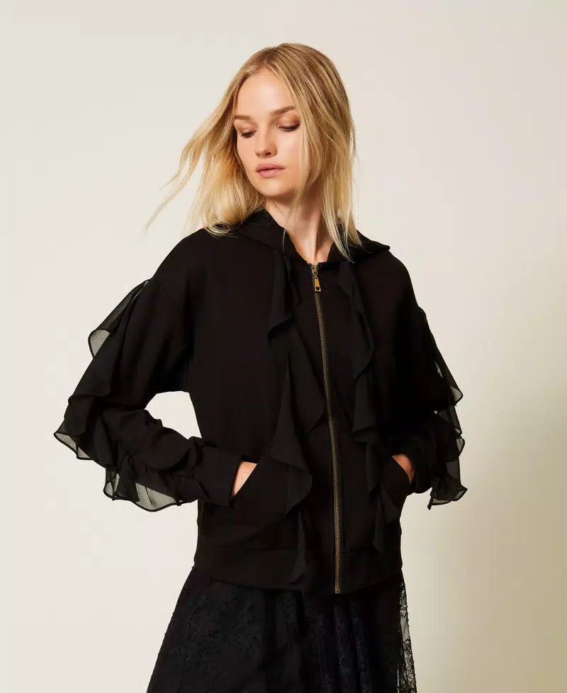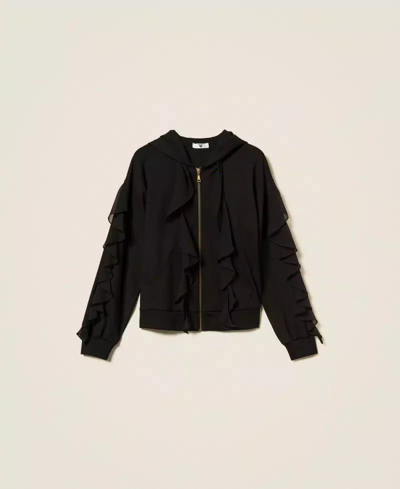This Twinset sweatshirt jacket blends cozy comfort with a flirty twist. Featuring delicate georgette ruffles around the neck and on the sleeves, it adds a playful flair to your casual look. The hood and light brass metal zip with a branded puller make it easy to wear, while the front kangaroo pockets and ribbed trims keep things relaxed and practical. Its loose fit invites endless layering fun.