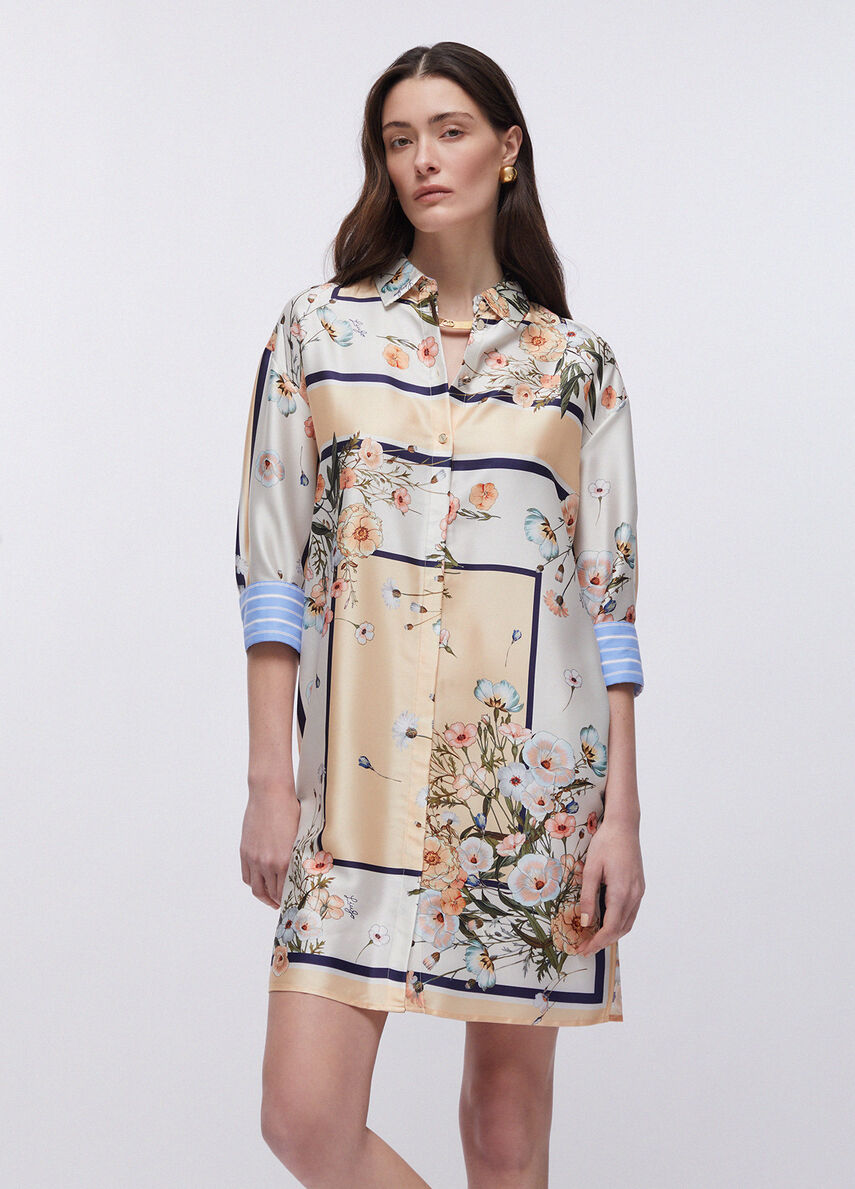 Elevate your wardrobe with this sophisticated LIU JO printed dress in a striking blue stripe bloom pattern. This short twill shirt dress offers effortless style and comfort. The three-quarter sleeves feature refined poplin cuffs for a polished finish, while the matching removable belt allows you to customize your silhouette.