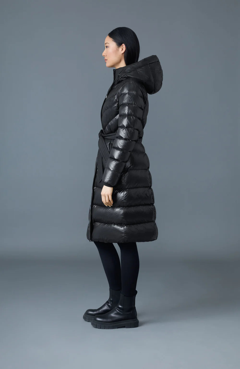 CORALIA is a weightless recycled down coat for women with a hood, and sash belt closure for customizable comfort. Machine washable and water resistant and repellent, storm cuffs and a drawcord-adjustable storm visor with a pillow collar deliver weathergrade protection. Safely store essentials with an inside pocket and welt pockets. Engineered with technical comfort for superior warmth, a modern icon to elevate any winter outfit.