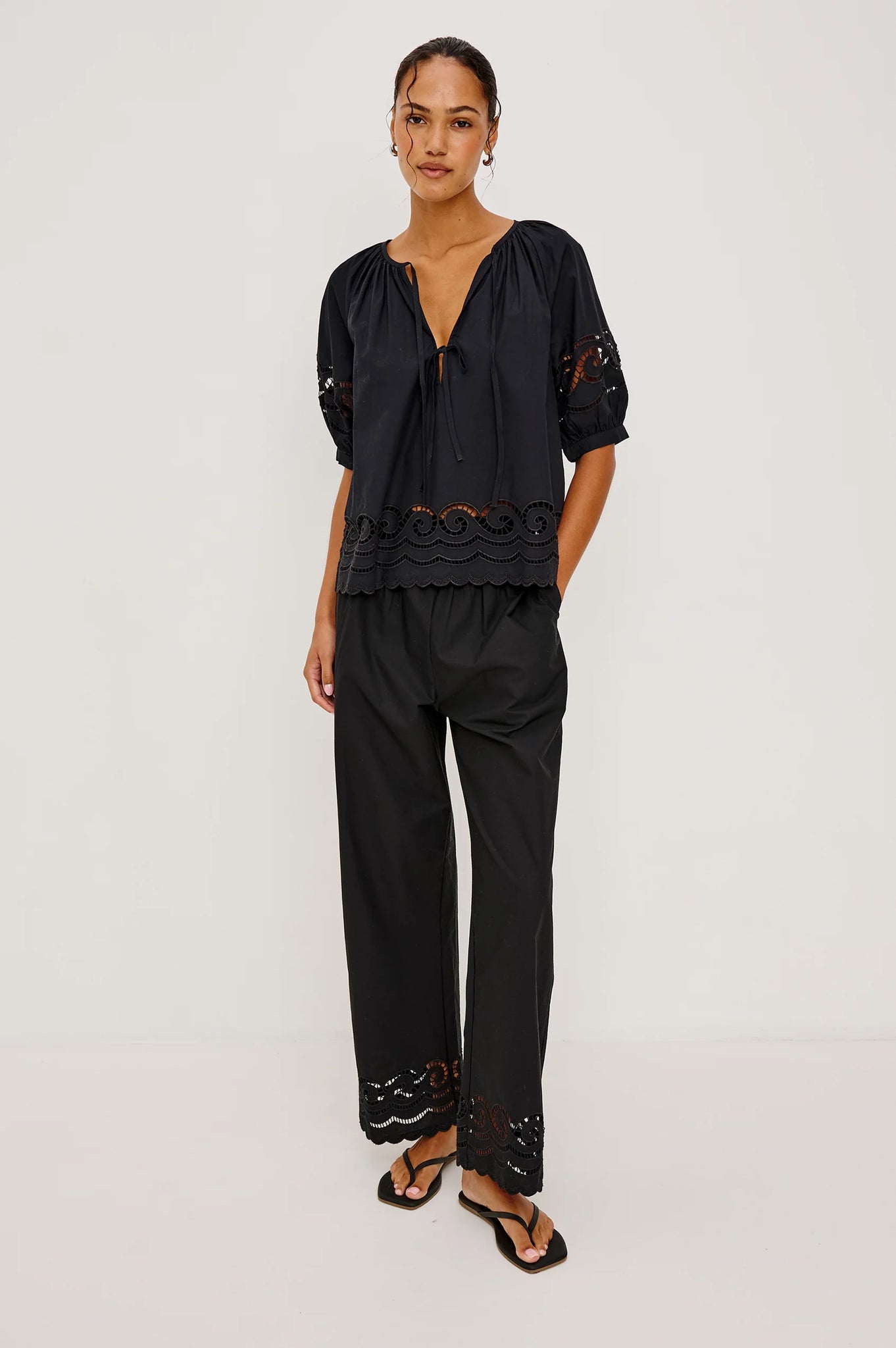 The Henrik is an elevated eyelet pant cut from cotton poplin with a shirred elasticated waistband. Designed with subtle pockets for convenience, this pant can be worn with the Catalene top or any of your Rails shirts.
