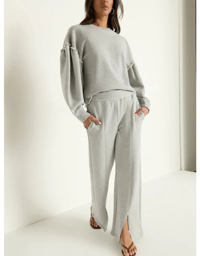 Elevate your cozy game with the Nation LTD. Shane Sweatshirt in Heather Grey. This everyday essential gets a stylish twist with its structured crewneck and raw drop shoulder hem, adding a playful edge to your look. Made from 100% heavyweight cotton and soft-washed for that perfectly broken-in feel, it offers a relaxed fit with just a hint of stretch. Perfect for lounging or layering, this sweatshirt combines comfort and flair effortlessly. Wear with the matching Lincoln Pant.