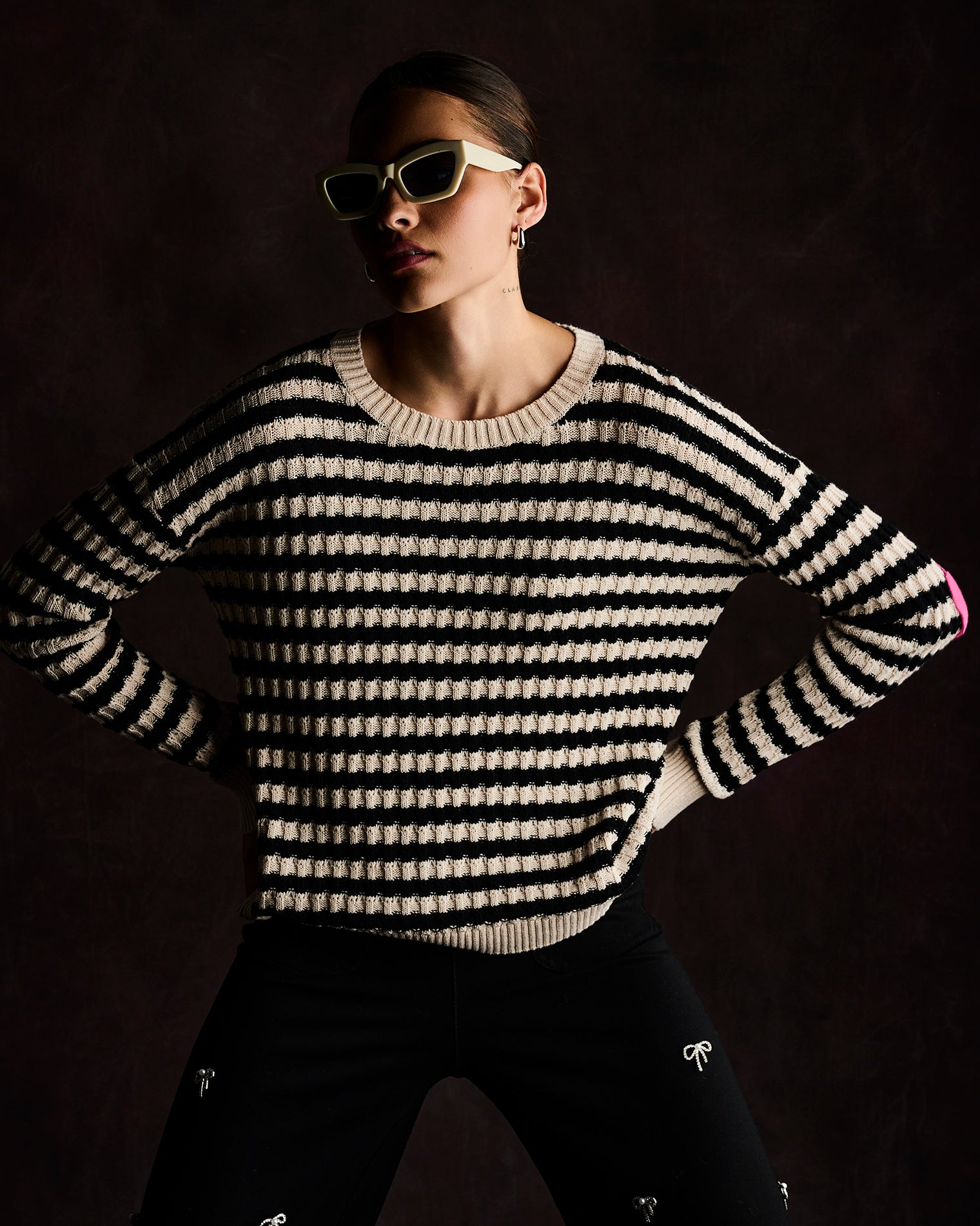Cozy up in the Lisa Todd It's Complicated striped sweater, featuring a playful broken heart motif. This long-sleeve luxury piece combines soft cotton-cashmere with a fun striped design, adding a touch of whimsy and warmth to your wardrobe. Perfect for those who love style with a little attitude!