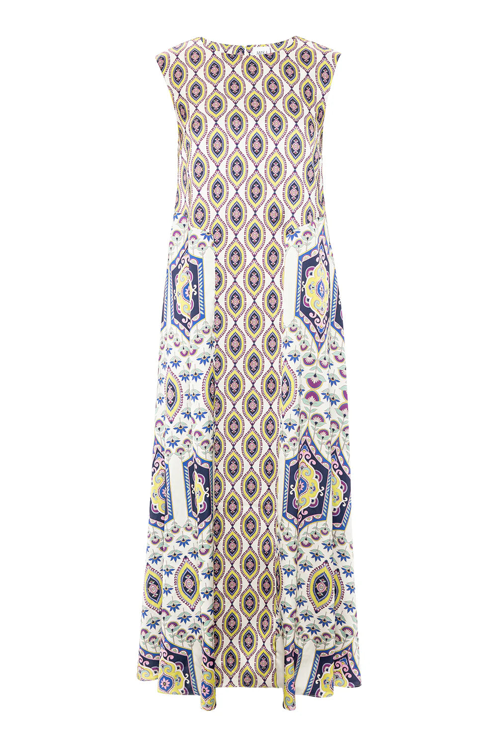 The Talitha dress is a striking new maxi silhouette cut from varying scales of our mosaic eye satin. Designed in a flowing A-line shape, this sleeveless style features a high neckline with a keyhole button closure at the back. Slightly fitted at the bust and relaxed through the body, it offers a universally flattering fit. The center panel showcases the smaller-scale print, while the side panels feature the larger scale, finished with a subtle high-low hem. A versatile statement style designed to carry you through this season and beyond.